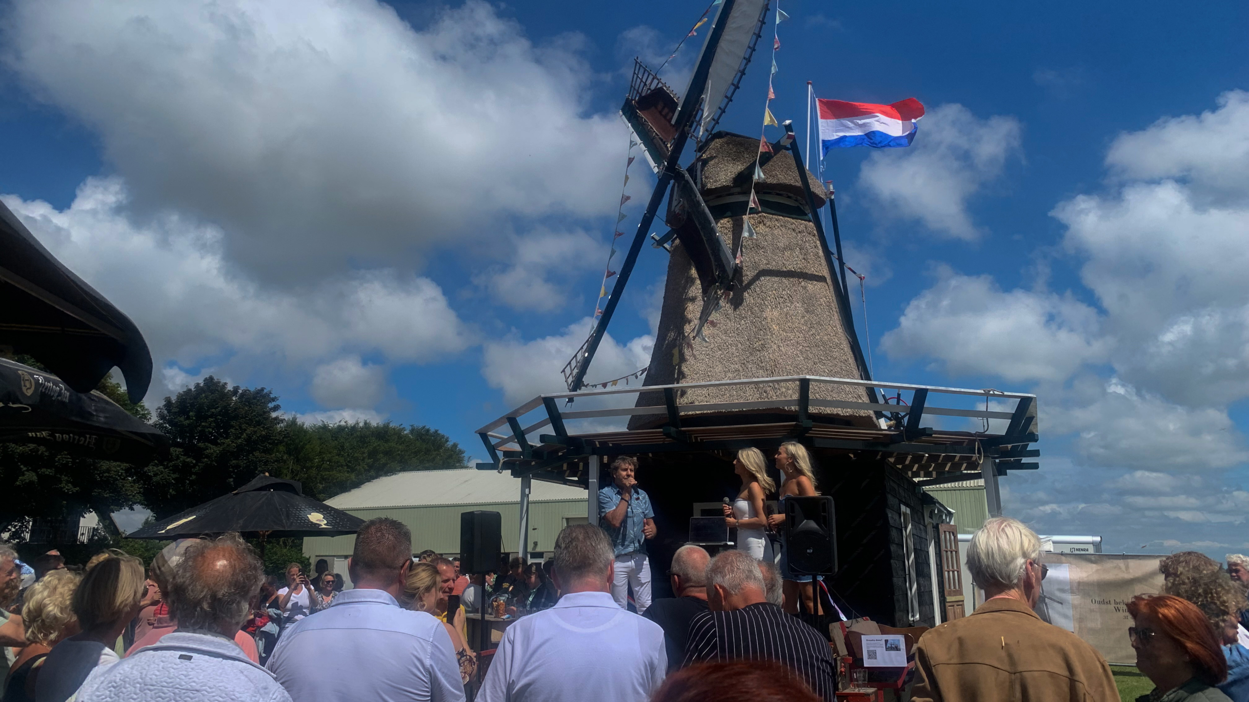 De zon brandt fel, het is warm aan de Zuideinderweg in Limmen. "Welkom leuk dat je er bent", lacht Stan onze verslaggever toe. Bij de molen klinkt muziek. Er zijn drankjes en niet te vergeten: er hangt een lint voor de grote opening. "Maar dat komt pas later vanmiddag", legt Stan uit. Het dorp loopt uit voor de opening. Oud en jong zit in de zon of staat in een partytent. "Hij boft maar met dit mooie weer", zegt Tiny Dekker. Samen met haar man is ze naar de opening van de molen gekomen. "Dit is een bijzonder moment, zeker voor Stan." (tekst gaat verder onder de foto)