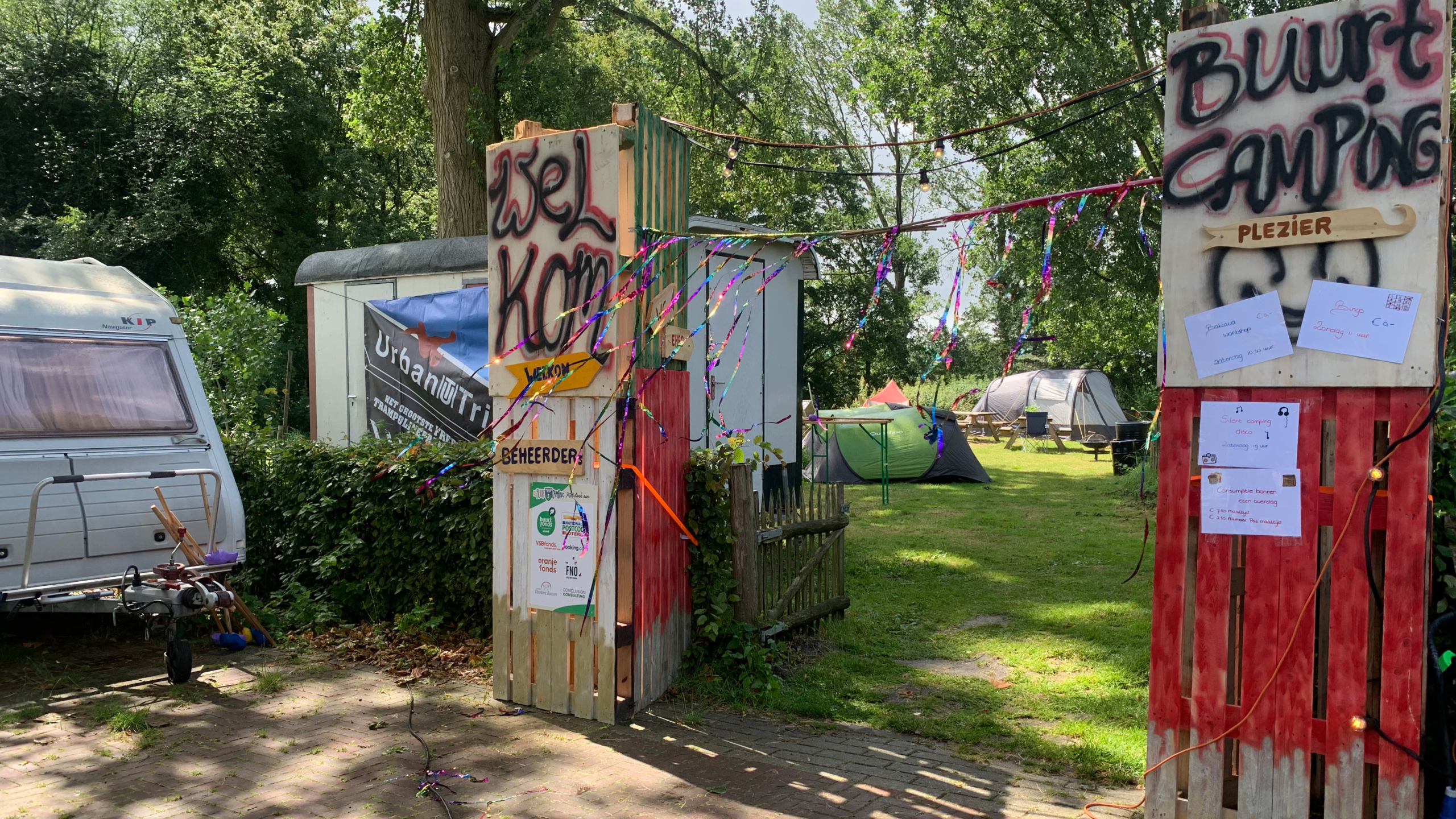 Ondanks de harde wind staan de tenten nog rechtop op het kampeerterrein.Het stopt met regenen en de zon laat zich zelfs even zien. "Het is hier omheind en heel erg beschut." Ozinga loopt over de pop-up camping. "Je leert hier mensen kennen uit je eigen wijk. Het is toch speciaal. 's Avonds een kampvuur, en dat terwijl je om de hoek van je huis bent. Dat geeft echt energie." Ondertussen komen Bentley en Julian de camping opgelopen. "Het is mijn eerste keer hier", vertelt Bentley. "Maar ik ben wel eerder op een camping geweest. Ik denk bijna iedereen wel hier." Julian is stagiair: "Ik vind het leuk hier in de omgeving. In deze wijk komen mensen samen." (tekst gaat verder onder de foto)