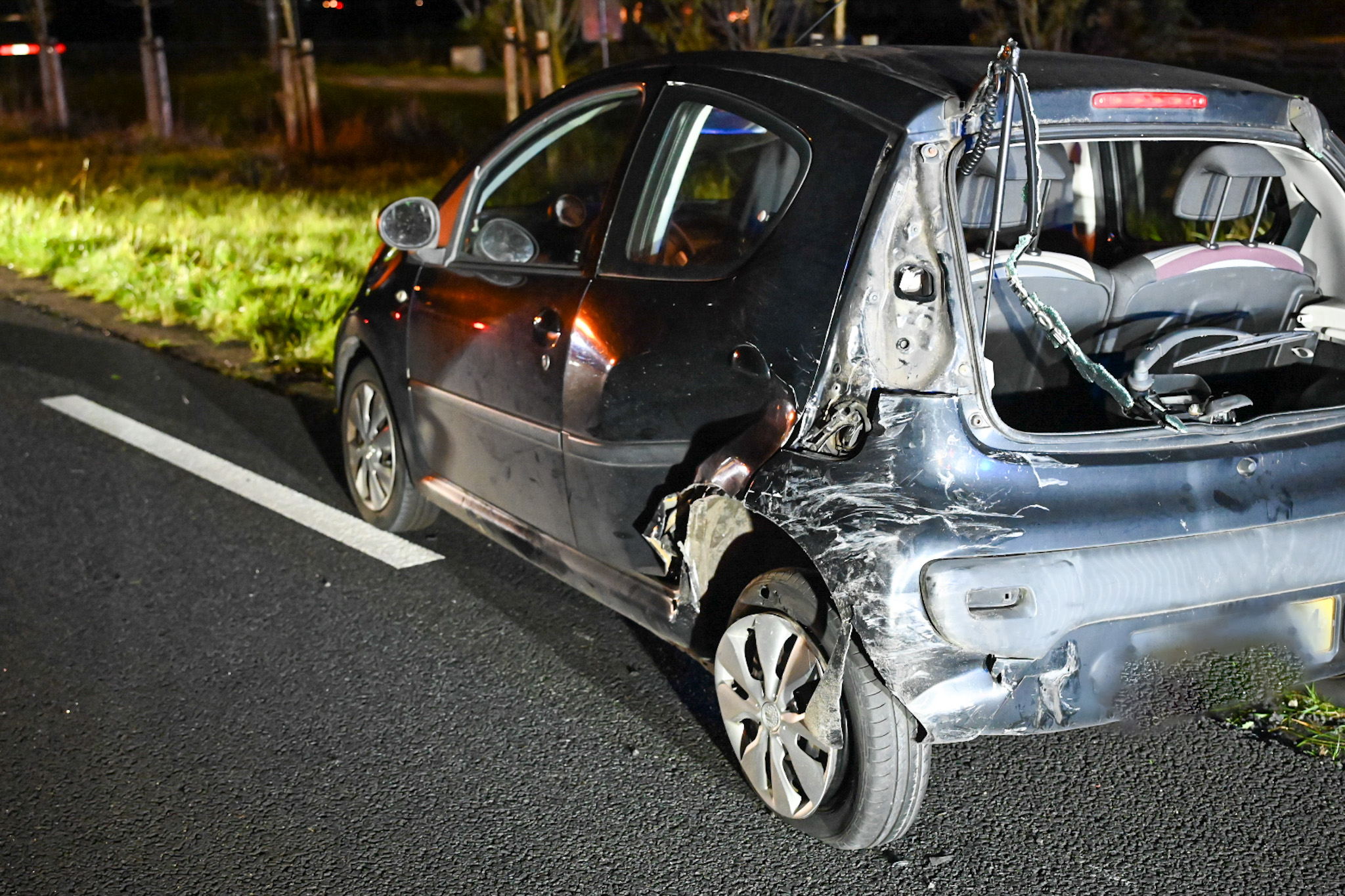 Die draaide door de klap om zijn as en kwam op de andere weghelft terecht. De achterste auto reed na de aanrijding nog 100 meter door en kwam daarna in de linker berm tot stilstand.