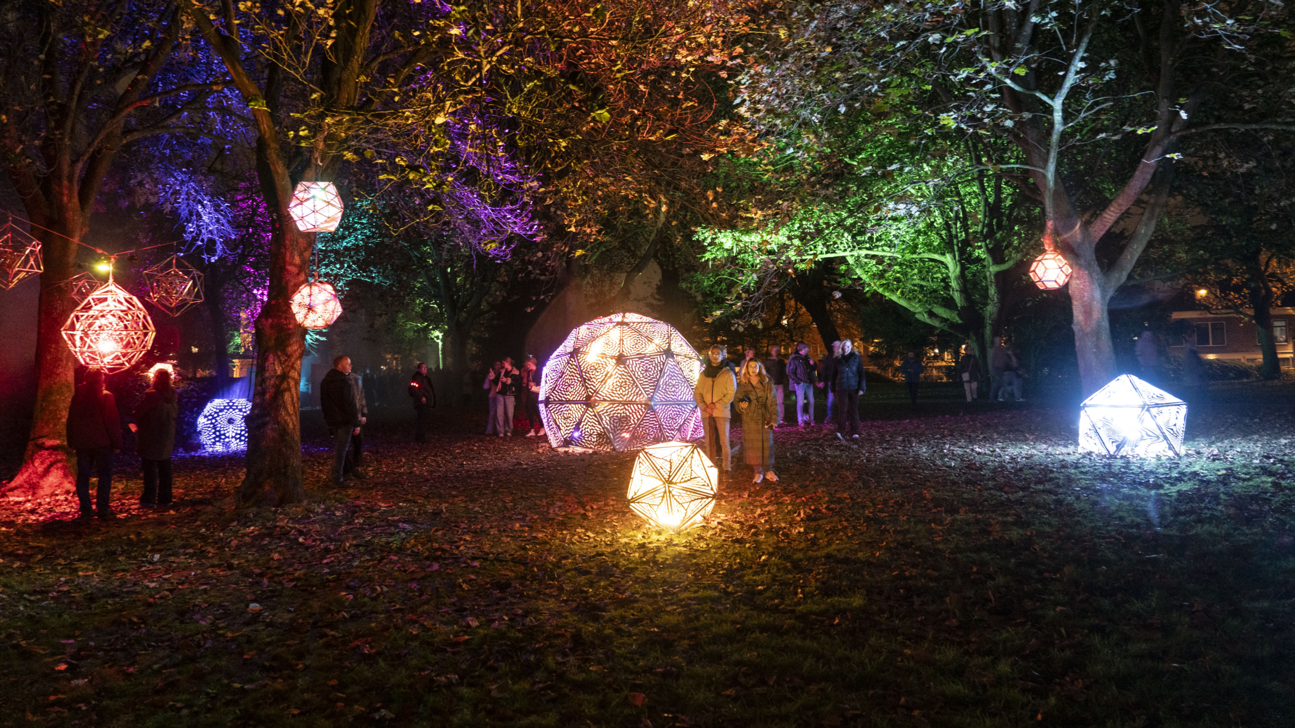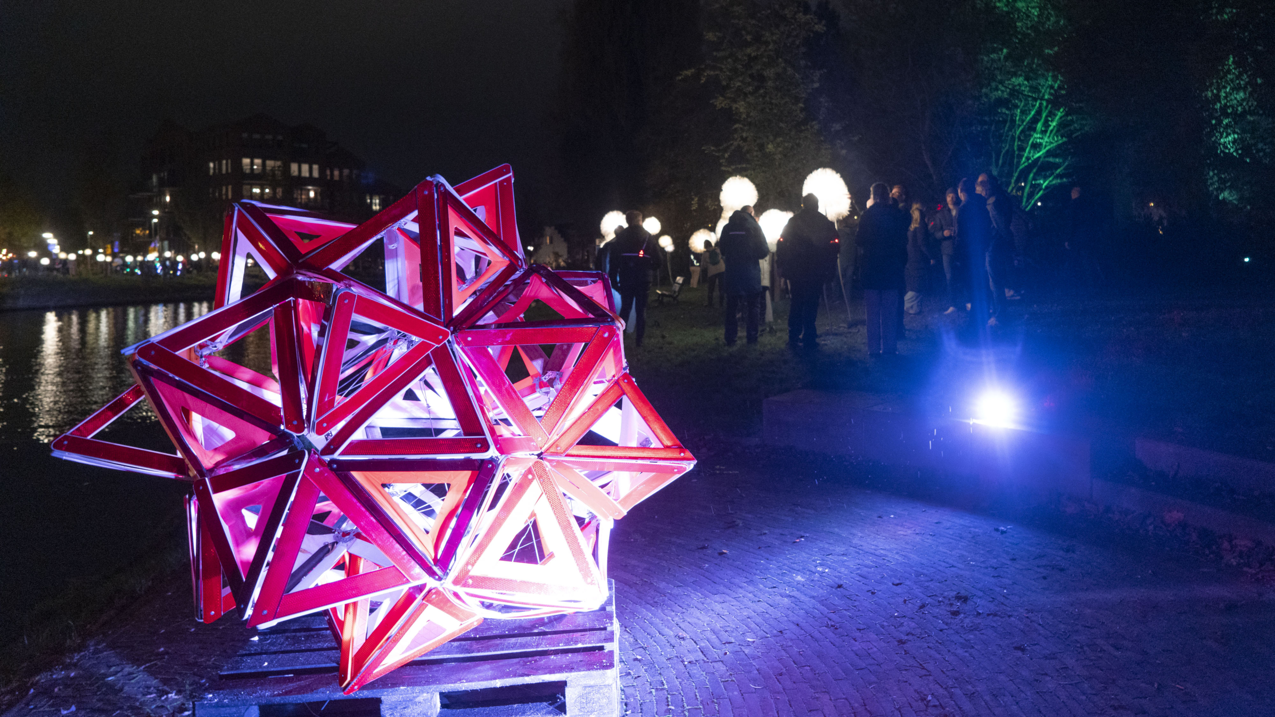 Het kunstwerk 'Walk In The Canvas' van de kunstenaarsgroep Social Skills in de Sint Jacobstraat (foto: Marco Schilpp)De wandelroute van zes kilometer kan zaterdagavond voor het laatst worden gevolgd. Gestart wordt bij de Drukkerij aan de Marconistraat, de Schelphoek en het IJkgebouw. Kaarten zijn online te bestellen vanaf 12,50 op de website van het Alkmaar Light Festival. (foto's: Marco Schilpp)