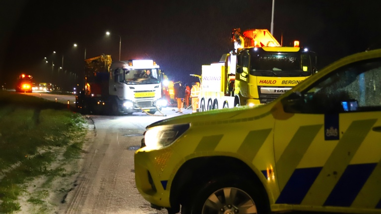 Zwaar materieel was nodig om geslipte vrachtwagens te bevrijden. (foto: RVP Media)Honderden automobilisten kwamen daardoor urenlang in lange files te staan. De parallelweg langs de N9 tussen Alkmaar en Schoorldam bood geen uitkomst, want daar lag ook een dik pak ijs. Hulpdiensten en bergers zijn de hele avond bezig geweest om gestrande voertuigen verder te helpen en de gladheid te bestrijden.