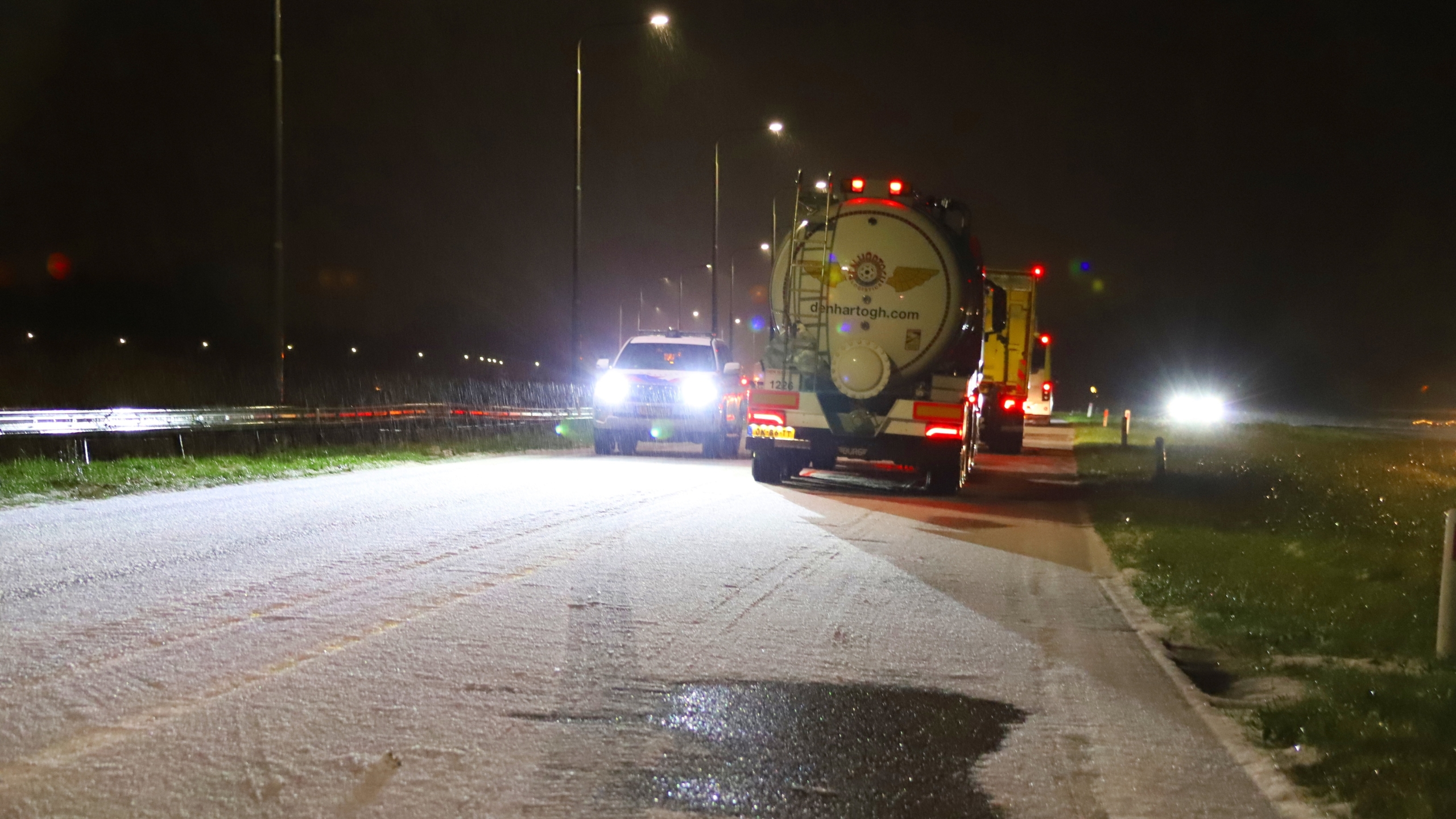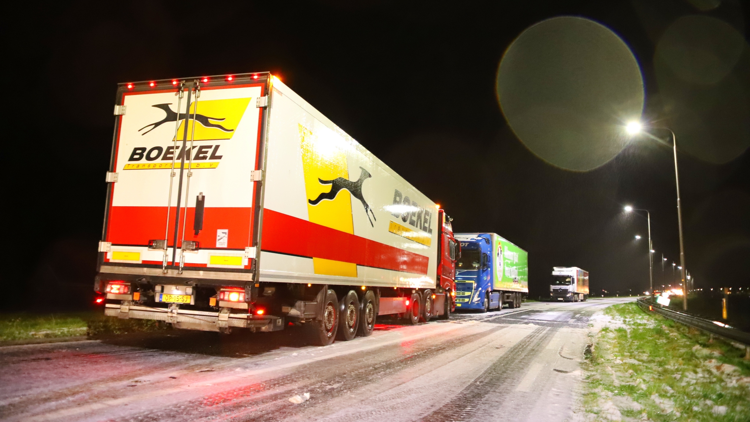 Vrachtwagens konden pas diep in de nacht hun weg vervolgen nadat ze bijna acht uur in de file hadden gestaan op de N9. (foto: RVP Media)Even na middernacht waren alle personenauto's van de weg geleid. Tien vrachtwagens stonden toen nog steeds vast. Pas rond 1:30 uur konden alle achtergebleven vrachtwagenchauffeurs hun weg weer vervolgen en was de rijksweg weer begaanbaar. (foto's: RVP Media)