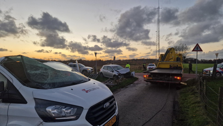 Door de harde klap sloeg de bestelbus drie keer over de kop en kwam deze meters verderop tot stilstand. Een omheining van een weiland en een lantaarnpaal sneuvelden daardoor. De personenauto strandde half in de berm en een weiland. De berm en een gedeelte van het weiland lagen bezaaid met de inhoud van de bedrijfsbus.