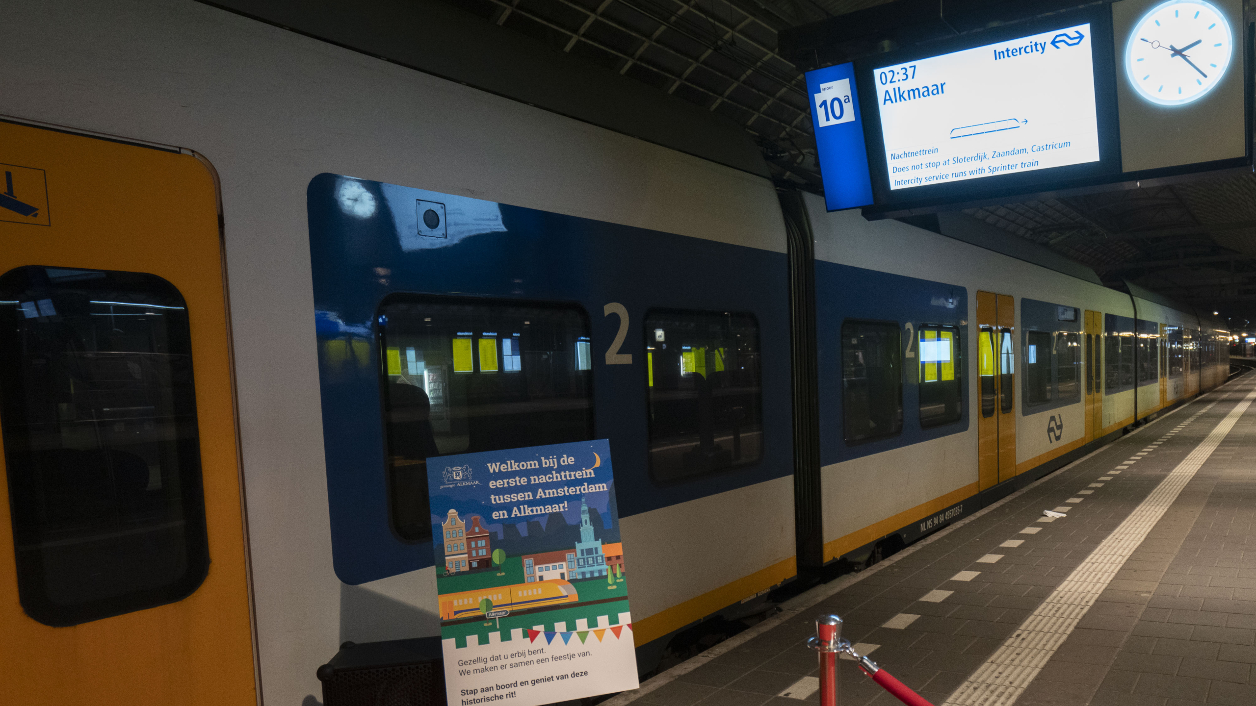 Het is vijf voor drie 's nachts. Buiten is het twee graden, door het Noord-Hollandse landschap tussen Uitgeest en Castricum rijdt de sprinter van de Nederlandse Spoorwegen richting Alkmaar. Twintig minuten eerder is iedereen ingestapt over een rode loper op perron 10a van Amsterdam Centraal. Wethouder Christiaan Peetoom is van de partij, samen met de productmanager en public affairs officer van de Nederlandse Spoorwegen. Zelfs een handvol raadsleden hebben zich gemeld om de feestelijke eerste rit mee te maken. (tekst loopt door onder de foto)