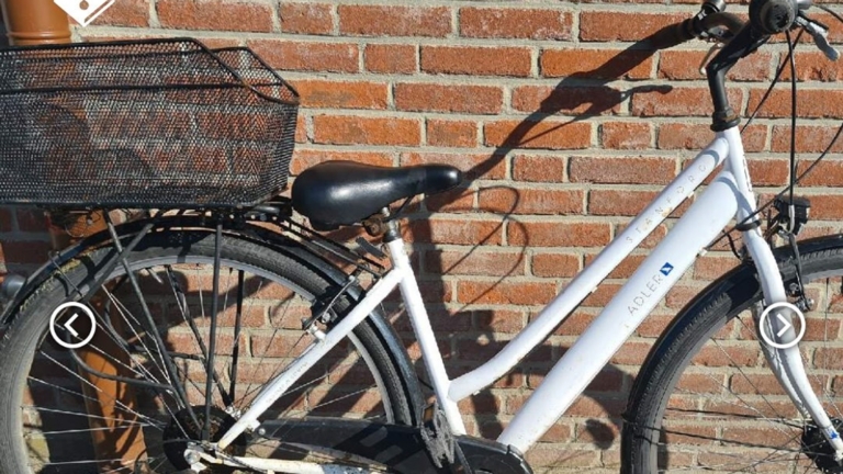 De twee fietsen zijn een zwarte Giant e-bike en een witte dames- of meisjesfiets van het merk Adler, met achterop een grote mand.