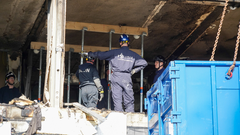 Om spullen makkelijk weg te kunnen gooien is een grote afvalcontainer voor de vernietigde appartementen gehangen met een telekraan. De onderzoekers worden bijgestaan door Service En Ondersteuning Nederland (SEON).