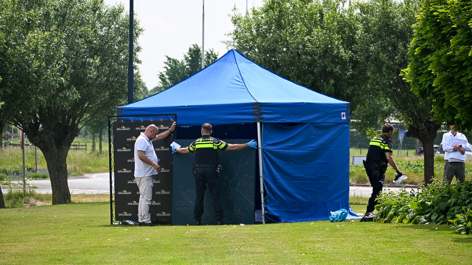 De politie heeft een blauwe tent rondom het slachtoffer geplaatst en onderzoek gedaan naar het incident. Over de identiteit van het slachtoffer is nog niets bekend.