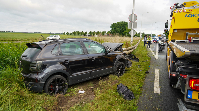 Een bergingsbedrijf heeft de sportieve VW Polo van de vangrail af getrokken en meegenomen. Vanwege het ongeval was een rijbaan tijdelijk afgesloten voor verkeer. De vangrail zal moeten worden gerepareerd. (foto's: RVP Media)