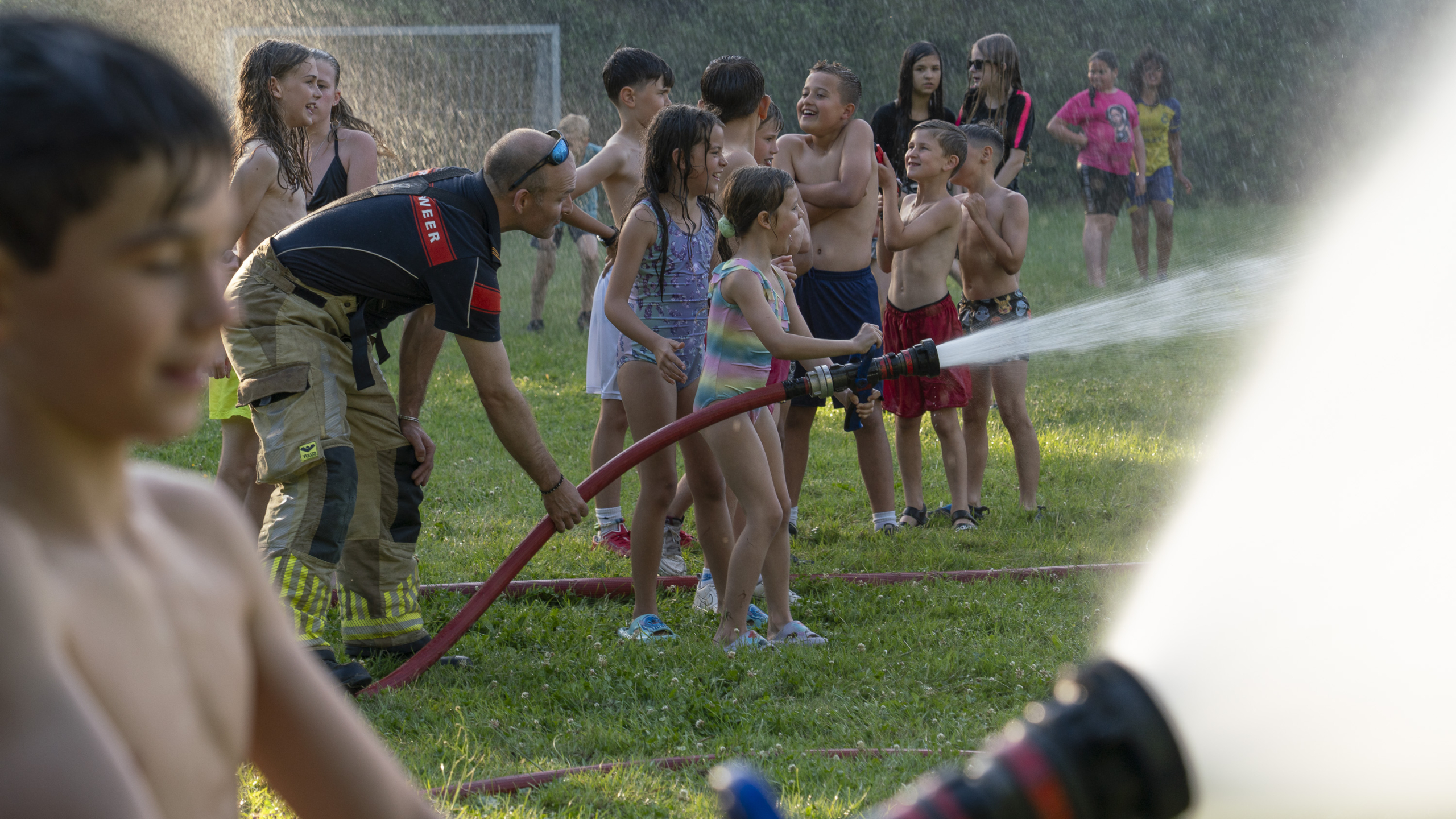 (foto: Marco Schilpp)Dat slootwater deerde blijkbaar niemand, want de oproep leidde tot een enorme opkomst van enthousiaste kinderen en ouders. Het slootwater spetterde de Koedijkers tegemoet, en de sfeer was fantastisch, zo blikt de brandweer van Koedijk terug op de warme zomeravond.