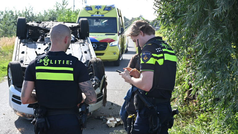 Een bergingsbedrijf is geschakeld om de auto weer op z'n wielen te zetten en af te slepen.