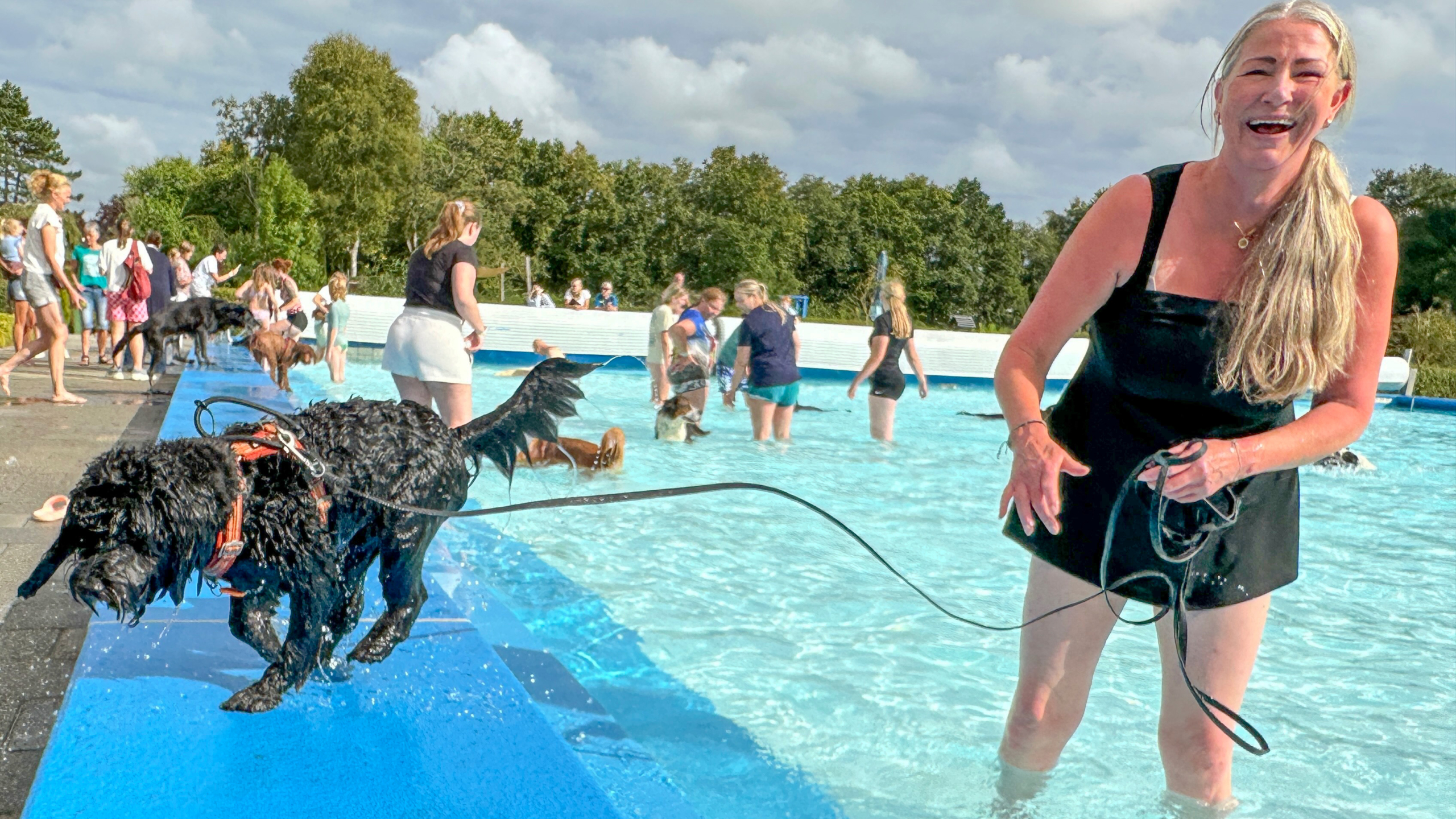 Veel honden genieten zichtbaar, anderen lijken overweldigd door alle nieuwe speelkameraadjes en durven nog niet het water in. "Veel baasjes vinden het nog leuker dan de honden zelf", lacht Eddy Bakker van exploitant Holland Sport. (tekst gaat verder onder de foto)