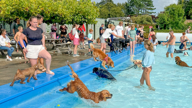Het zwemseizoen van buitenzwembad Het Baafje is maandag op feestelijke wijze afgesloten. Niet de vaste badgasten, maar hun trouwe viervoeters kregen de kans om nog één keer het verkoelende water in te springen tijdens het traditionele hondenzwemmen.