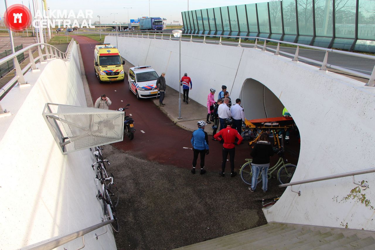lkmaar, 14 februari 2014. Een wielrenner is vrijdagochtend gewond geraakt toen de man, fietsend met vijf anderen, de fietstunnel inreed onder de N242 door richting Stompetoren. De man kwam in botsing met een scooterrijder en beide mannen vielen op de grond. De fietser is door het ambulancebroeders gestabiliseerd en daarna met spoed afgevoerd naar het ziekenhuis. De andere wielrenners bleven ongedeerd. De carbonfiets van het slachtoffer is achter het balhoofd afgebroken en ook één van de tandwielen is in stukken. Het ongeval wordt onderzocht door de politie.