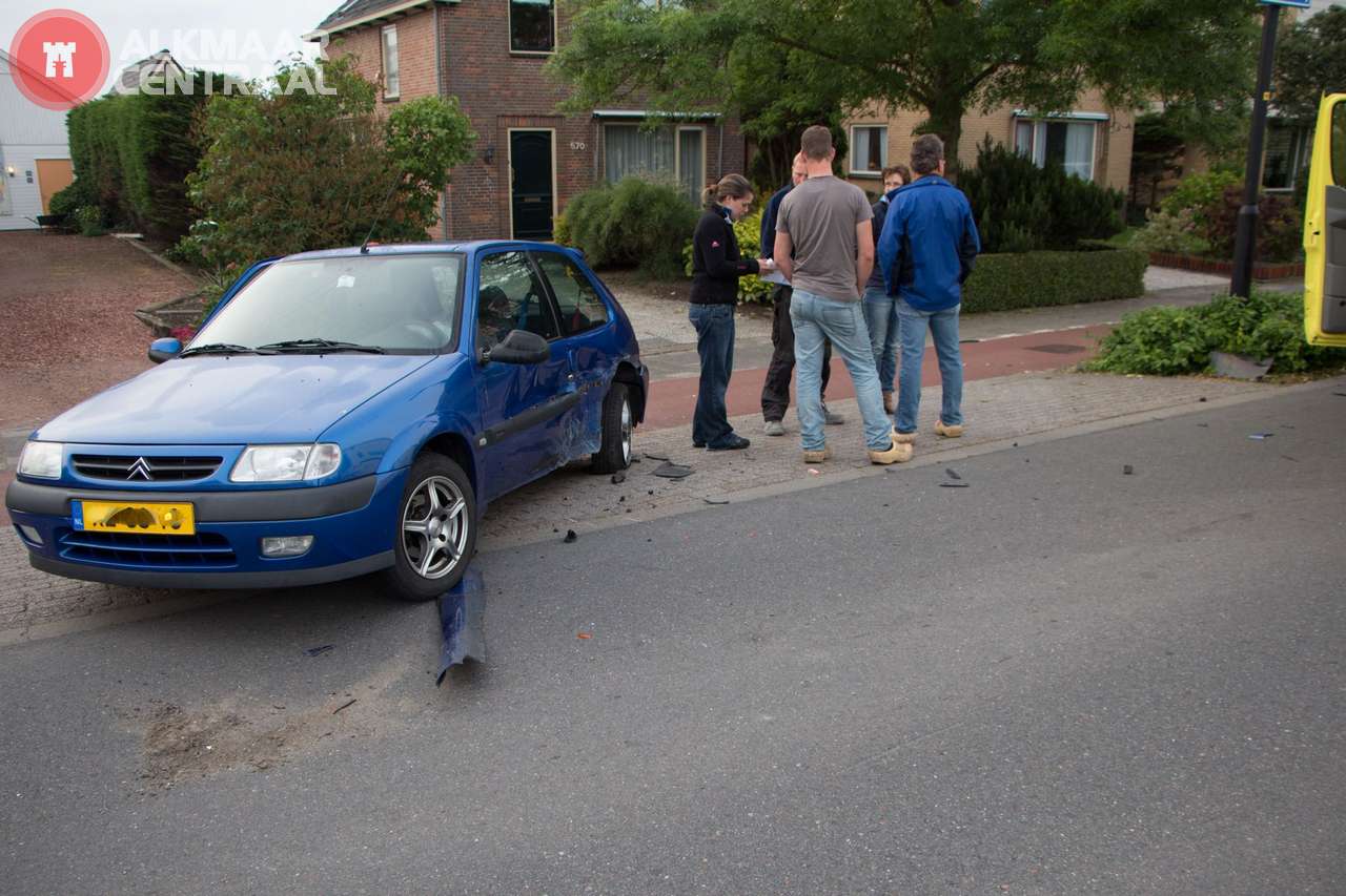Heerhugowaard, 25 mei 2014. Maandagochtend zijn bij een ongeval op de Middenweg in Heerhugowaard twee auto's zwaar beschadigd geraakt. Beide bestuurders bleken na controle door ambulancepersoneel ongedeerd te zijn en kwamen dus met de schrik vrij. Met beide voertuigen is het minder goed afgelopen, die moeten waarschijnlijk als total-loss worden beschouwd. Het ongeval gebeurde rond 06.00 uur toen de bestuurder van een Volkswagen Caddy 'iets wilde pakken'. De auto kwam daardoorj ter hoogte van de Plaetmanstraat op de verkeerde weghelft terecht. De automobiliste die hem tegemoet reed zag de caddy op zich af komen maar kon niet meer ontsnappen omdat ze naast een vluchtheuvel reed. De Caddy ramde haar Peugeot in de flank, knalde daarna tegen een paal en schoof maar net langs een geparkeerde auto de bosjes in.