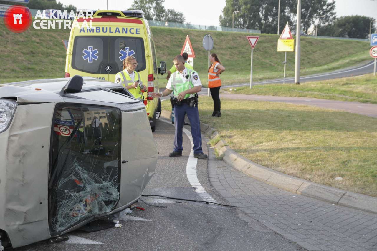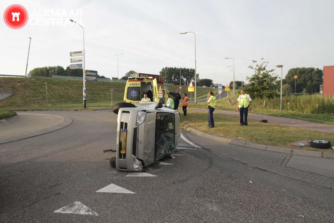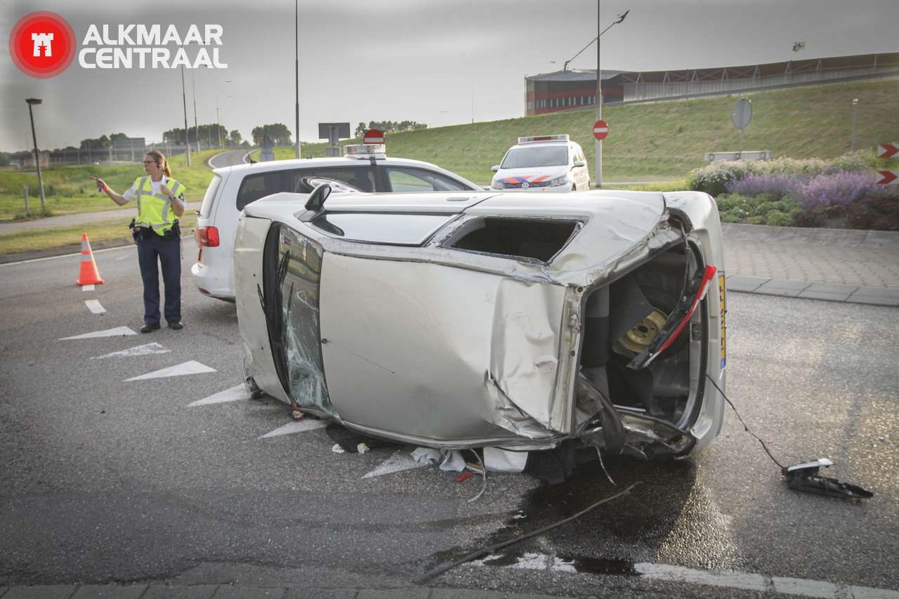 Alkmaar, 28 juni 2014. Vrijdagavond is een jonge automobilist betrokken geraakt bij een eenzijdig ongeval op de Smaragdweg. Hij reed richting de Kooimeerplein maar raakte de stoeprand, verloor de controle over het stuur,vloog over de kop en ramde twee lichtmasten. De auto bleef uiteindelijk op zijn kant op het wegdek van één van de rotondes bij het AFAS Stadion liggen. Drank heeft waarschijnlijk een rol gespeeld bij het ongeluk, de bestuurder is na het afleggen van een blaastest naar het ziekenhuis gebracht waar ook een bloedtest is afgenomen. De geleende auto kan als total-loss beschouwd worden, de dienst Verkeers Ongevallen Analyse van de politie onderzoekt het ongeval. (foto's: DNP.NU)