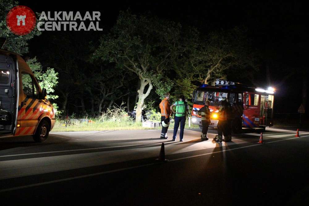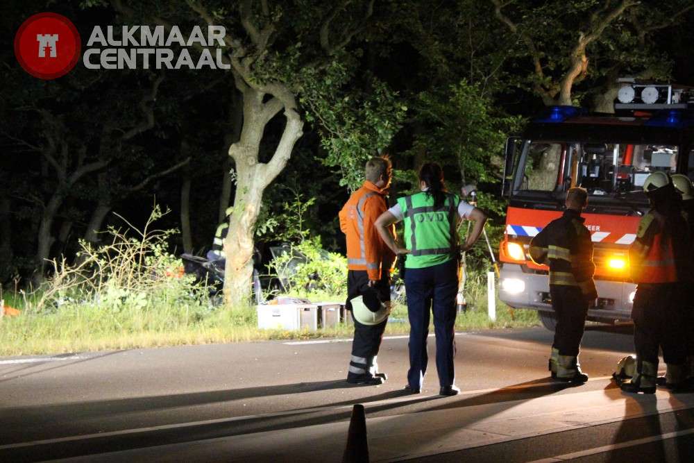 Bergen, 05 juli 2014. Vrijdagavond is er op de Zeeweg in Bergen aan Zee een eenzijdig ongeval gebeurd waarbij de bestuurder van een Audi om het leven is gekomen. Het ongeluk gebeurde rond 23.15 toen het slachtoffer van Bergen aan Zee richting Bergen reed en in de laatste bocht voor de rotonde de berm raakte, in een slip terechtkwam en een boom ramde. Hulpverlening was in grote getale aanwezig, maar ondanks inzet van brandweer, ambulance en traumahelikopter overleed de 43-jarige automobilist uit Egmond aan den Hoef ter plaatse. De Zeeweg was enige tijd afgesloten voor de hulpverlening (foto's: DNP.NU/Lorenzo Derksen)