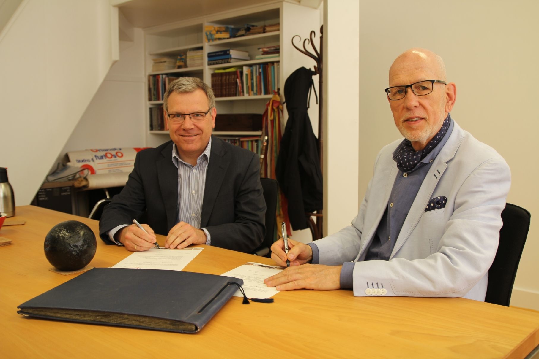 Foto's: Paul Post en Leens Spaans ondertekenen de schenkingsakte, en drie foto's uit de collectie (bron: Regionaal Archief Alkmaar)