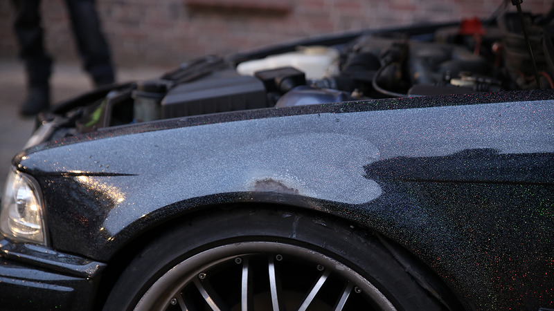 Een gedeelte van de binnenkant van het spatbord was al aan het smelten en branden. Een snelle actie met twee emmers water kon erger voorkomen. De gealarmeerde brandweer hoefde het bluswerk alleen nog maar te controleren. Toch heeft de auto flinke schade opgelopen. Het spatbord zal vervangen moeten worden en dat is door de speciale laklaag een kostbare zaak. Ook de velg raakte beschadigd. De auto is al twee keer eerder het doelwit van vernielingen geweest.
