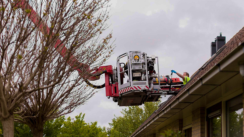 De vrouw moest op een 'plank' met behulp van een hoogwerker uit het huis gehaald worden. Ze is per daarna per ambulance naar het ziekenhuis vervoerd. (foto's: DNP.NU)
