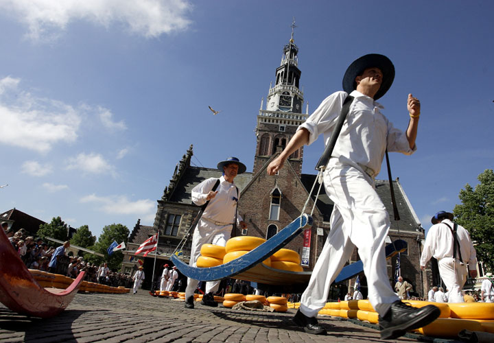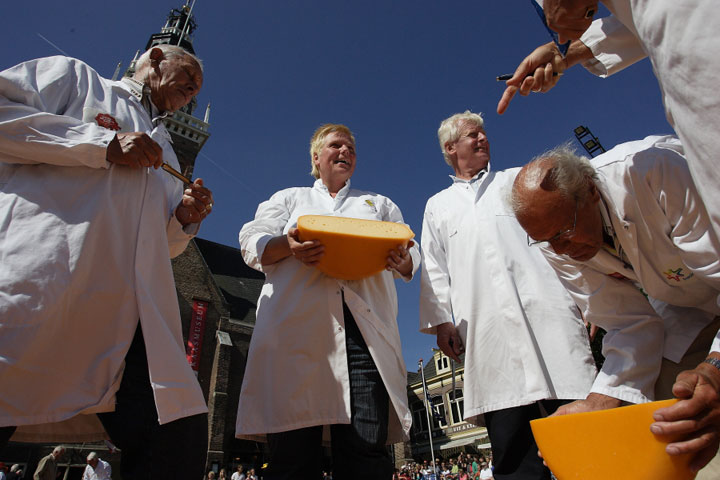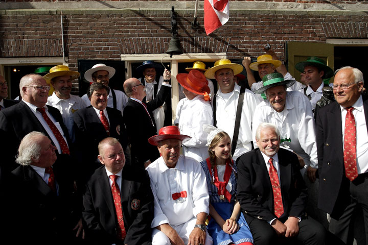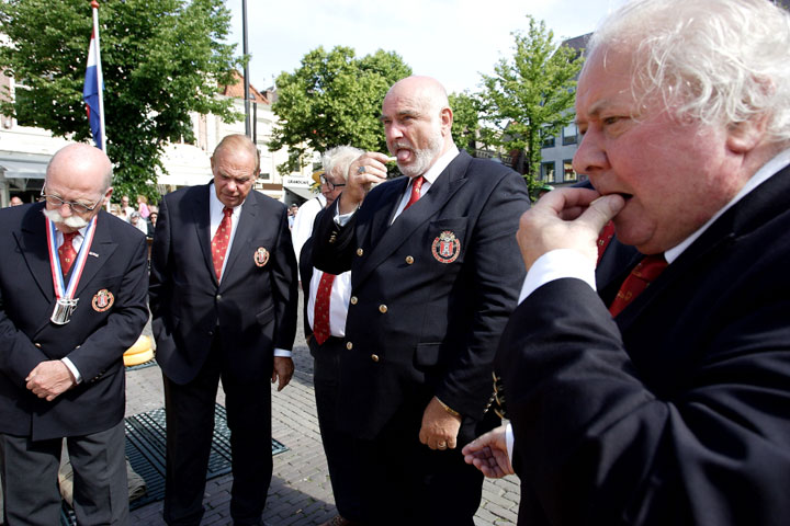 Alkmaar, 03 juni 2011. Een goed glas bier en een lekker blokje kaas is altijd een fijne combinatie. Dus verliep het vanmorgen op de Kaasmarktook allemaal uitermate gemoedelijk tussen de mannen van het Kaasdragersgilde en de heren van Biergilde 'De Tempelier'. Bierproevende kaasdragers zijn niet gesignaleerd, maar kaasproevende Biergilde-leden waren ruim voorradig op het Alkmaarse Waagplein waar het gilde dat deze maand het 25-jarig jubileum viert, vanmorgen de eer had om de weer druk door toeristen bezochtte Kaasmarkt te mogen openen door het luiden van de bekende bel. Marco Schilpp was in de buurt en maakte enkele foto's.