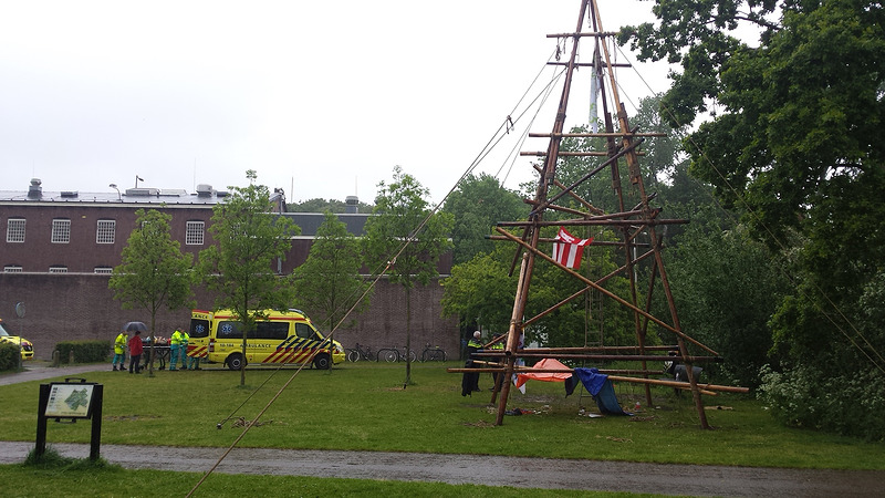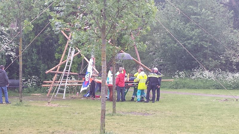 De ladder waar de man vanaf viel stond tegen een tokkeltoren van de scouting. Twee ambulances kwamen ter plaatse om de man te behandelen en vervolgens naar het ziekenhuis te brengen. Hij verkeert buiten levensgevaar. (foto: DNP.NU/Lorenzo Derksen)