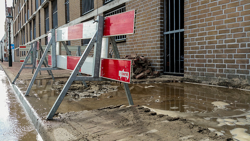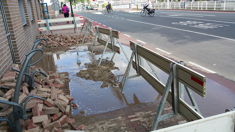 Zondagmiddag stond het voetpad en een gedeelte van de straat van de Kanaalkade in Alkmaar blank. Er bleek een koppeling van de waterleiding door grondzetting lek te zijn geraakt. Grondzetting is de beweging van grond door externe omstandigeheden zoals bijvoorbeeld voorbijrijdende (vracht)wagens. PWN heeft na de melding onmiddelijk actie ondernomen en op zoek gegaan naar het lek.