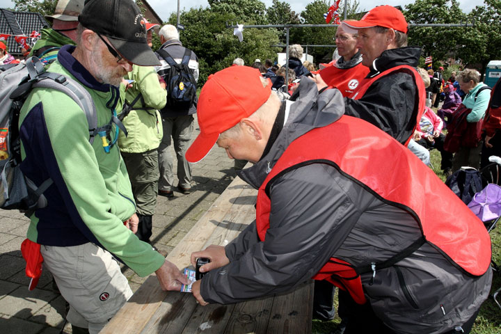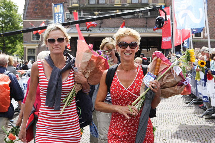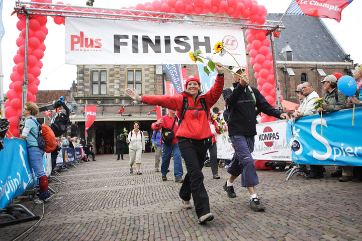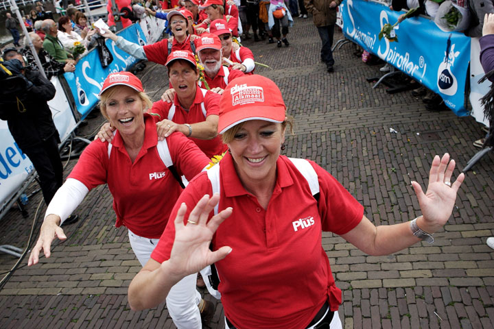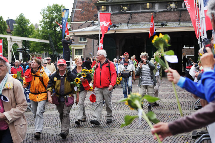 Alkmaar, 19 juni 2011. Gisteren zijn onder massale belangstelling de wandelaars van de jubileumeditie van de Plus Wandel4Daagse Alkmaar binnengehaald op het Waagplein in Alkmaar. Maar liefst 7.356 wandelaars legden de laatste meters af over de rode loper in de Langestraat en door het Waaggebouw. Uiteraard kregen alle deelnemers onderweg de bekende zonnebloem aangereikt. Uniek bij deze vijfde editie was het grote videoscherm waarop wandelaars die alle vijf edities hebben meegelopen hun naam en zichzelf in beeld voorbij zagen komen. De Wandelvierdaagse heeft deze keer door het wisselvallige weer wel wat mindere dagen gekend, ook gisteren was het nat en koud. de sfeer werd er echter niet minder door. In 2012 wordt de 6e Plus Wandel4Daagse Alkmaar gehouden van woensdag 20 t/m zaterdag 23 juni. Onderstaande foto's zijn gemaakt door Marco Schilpp, een videoverslag vind je HIER