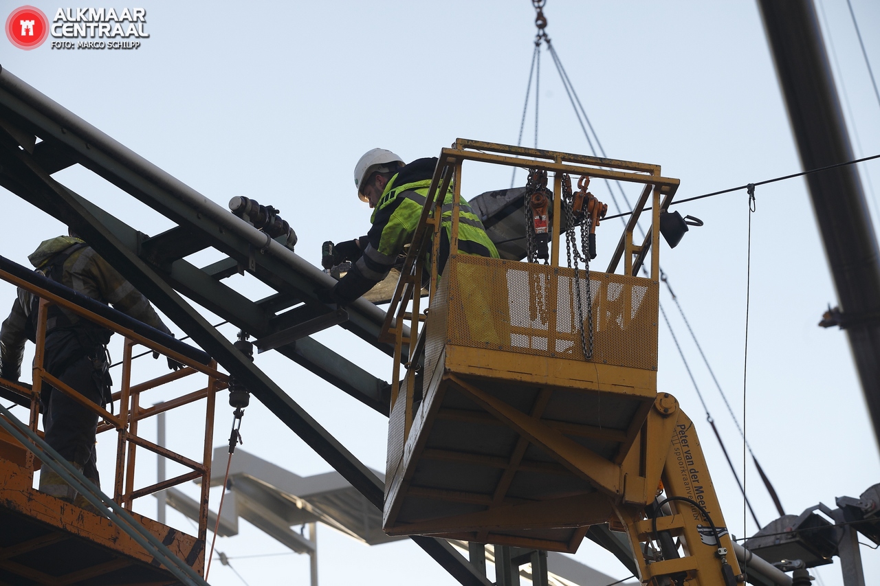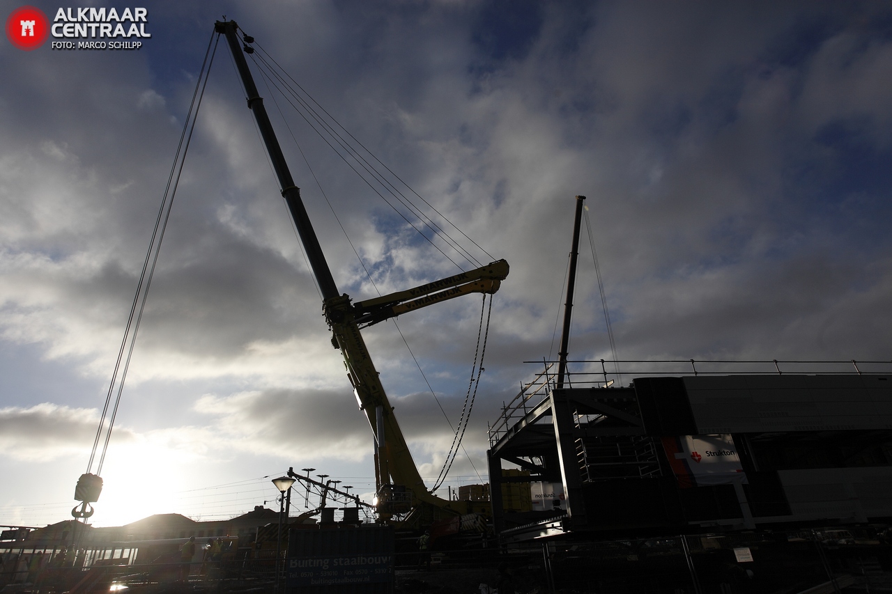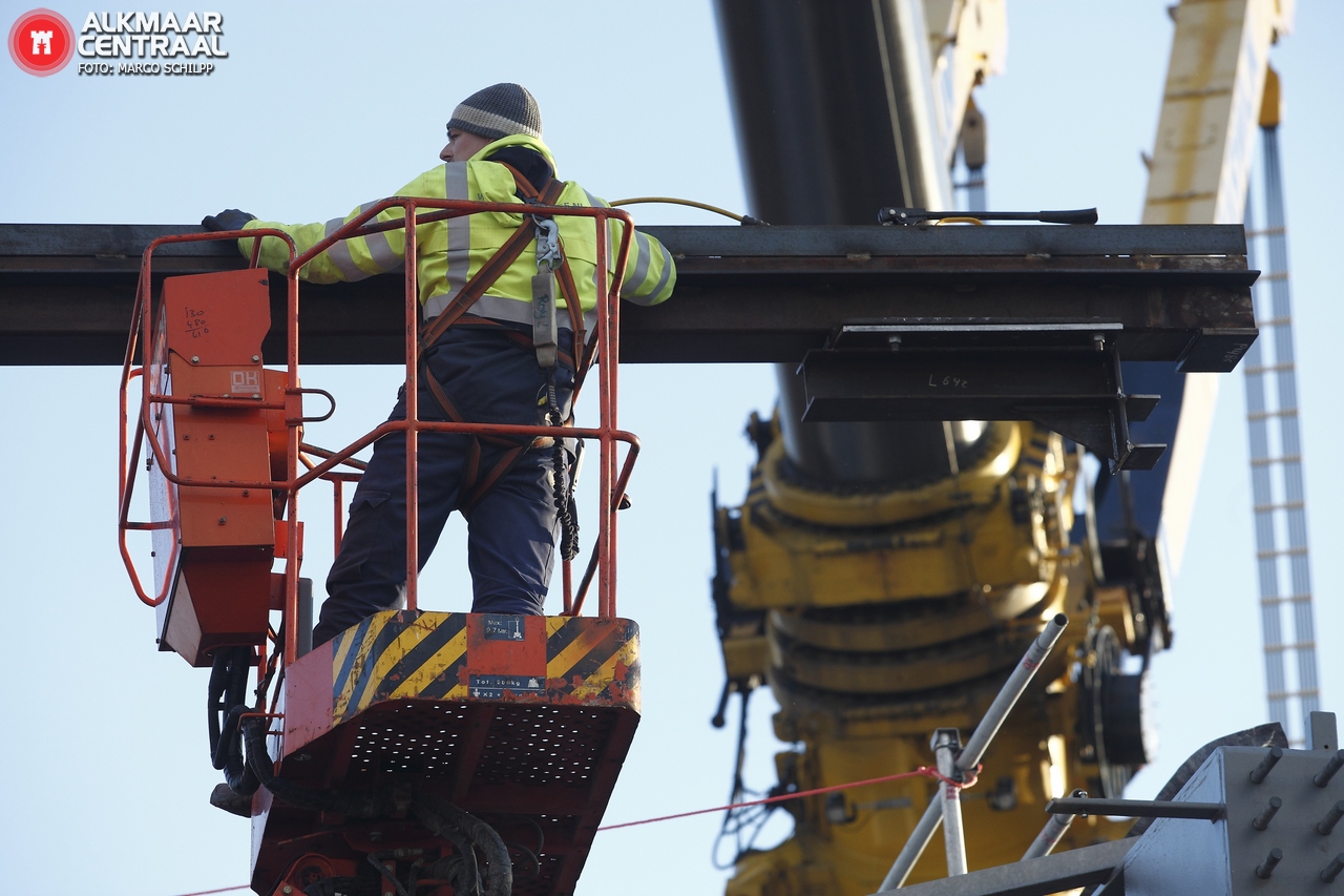 Alkmaar, 02 februari 2015. De plaatsing van de voetgangersloopbrug en bijbehorende delen trok zaterdag veel belangstelling. Wat toeschouwers zagen was een plaatsing die door goede planning en gunstig weer soepel verliep. Ook fotograaf Marco Schilpp was erbij en legde een en ander vast op de gevoelige plaat.