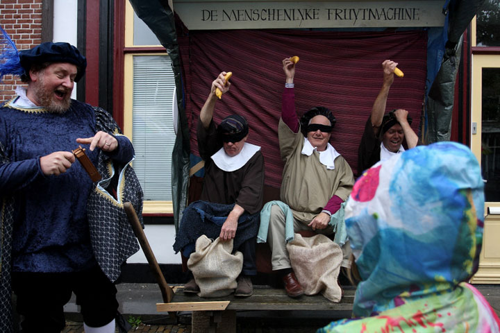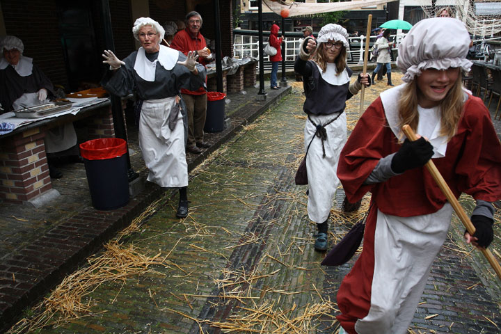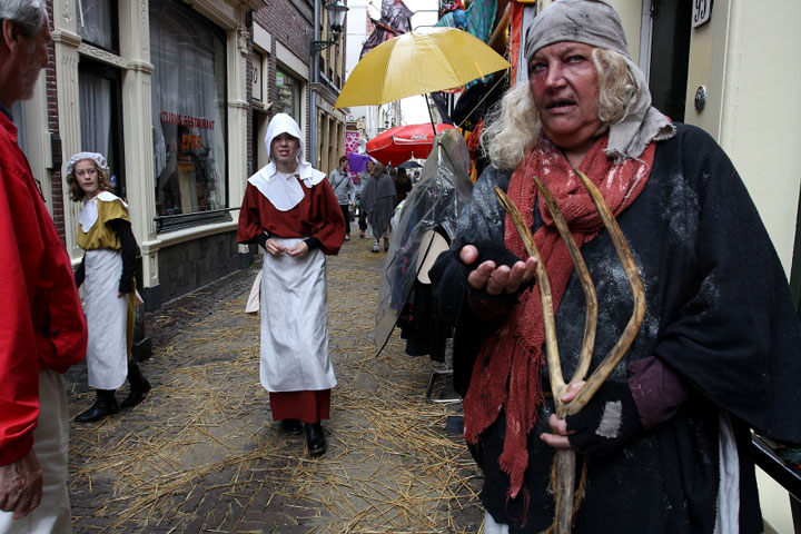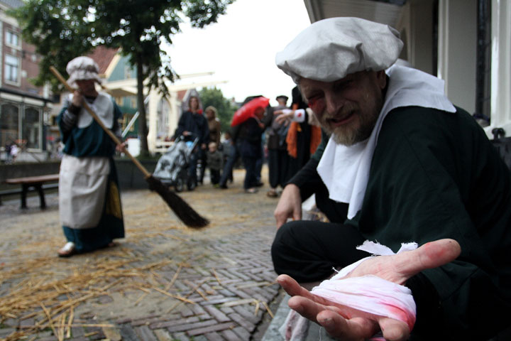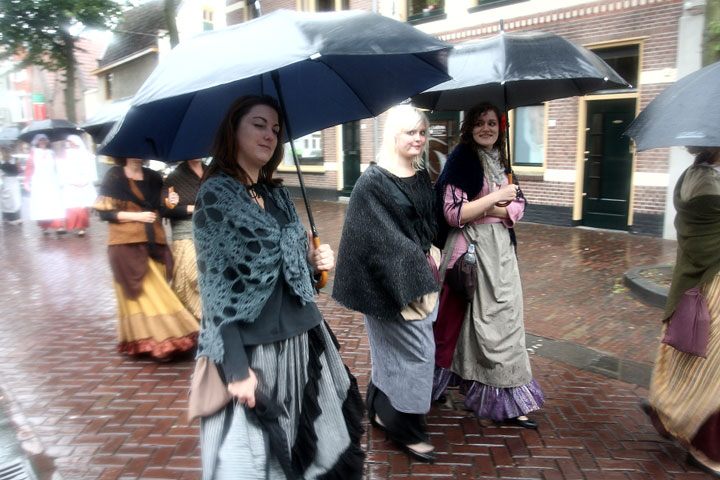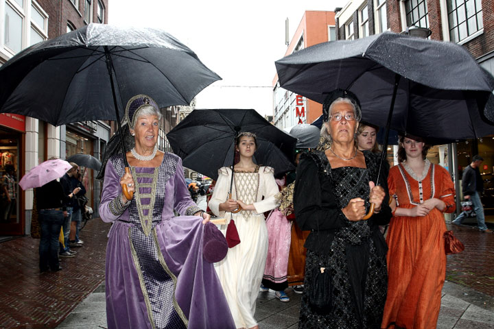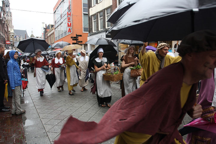 Alkmaar, 25 juni 2011. Met de beste wil van de wereld kon je het vanmorgen niet droog noemen. En toch stonden de vierhonderdvijftig gekostumeerde vrijwilligers geduldig op de Limmerhoek in Alkmaar te wachten tot ze als bonte stoet konden vertrekken naar het Waagplein, waar Burgemeester Bruinooge met een toespraak en Gijsbert van Haerlem met een vuurspuugact Kaeskoppenstad 2011 openden (zie foto's hieronder). De regen weerhield ook de bezoekers er niet van toch de stoet even langs de route te bekijken en het in de tijd teruggereisde stuk Alkmaar te bezoeken. Morgen wordt het beter weer en wordt er een fors aantal bezoekers verwacht. Kaeskoppenstad is in 2007 bedacht door reclamebureau RAADHUIS en het idee werd enthousiast omarmd door LIONS Alkmaar Victoria die een mogelijkheid zag geld in te zamelen voor goede doelen. Naast een hoofddoel worden dankzij Kaeskoppenstad ook tal van lokale doelen financieel geholpen. Een goede reden om eens langs te gaan. Hierboven alvast wat sfeervolle plaatjes geschoten door fotograaf Marco Schilpp. Later volgt ook een videoimpressie.