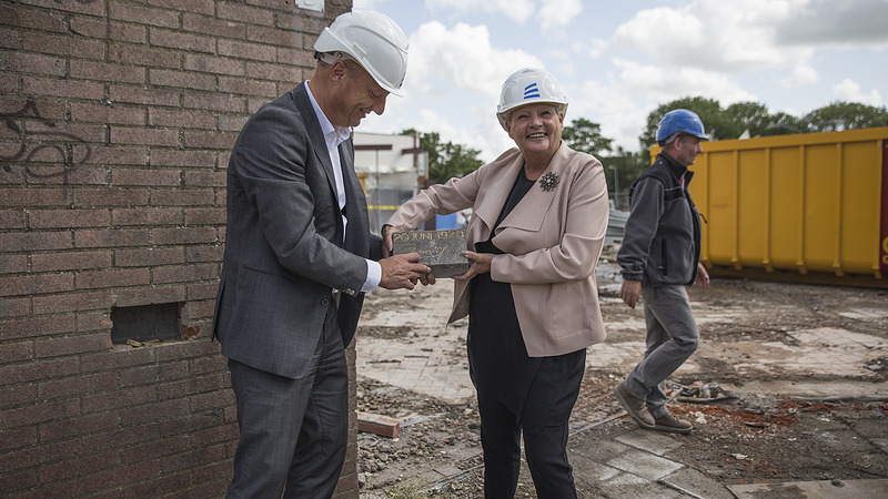 Donderdagmiddag kreeg de afronding van de eerste fase van de sloop van de Polderhof in Oudorp een officieel tintje. Wethouder Elly Konijn en Niels Doodeman, directeur Heddes Bouw & Ontwikkeling, verwijderden uit het laatst overgebleven stukje muur wat ooit 'de eerste steen'was. Deze is op 20 juni 1979 gelegd door raadslid Zandbergen van de KVP (voorloper van het CDA). Daarna werkte de wethouder het laatste stukje muur tegen de vlakte met een graafmachine. Ook de 'burgemeester van Oudorp', Cor Bos, was aanwezig. De steen wordt veiliggesteld en zal weer een plekje krijgen in het nieuwe Polderhof.