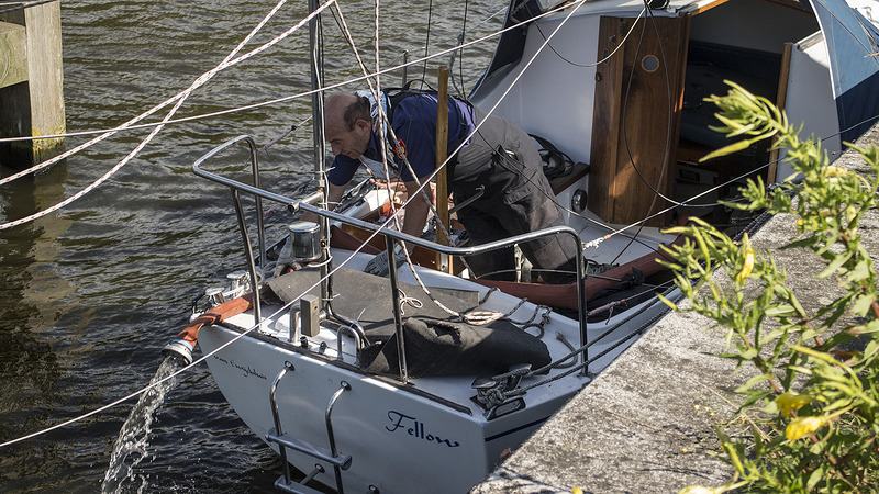 Daarna paste de Fellow wel onder de brug door en kon, met de brandweerpomp aan boord, koers gezet worden naar Nicolaas Witse om daar de boot uit het water te laten halen.