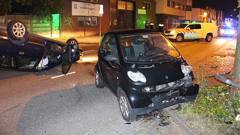 De schade ter plaatse was fors, niet alleen lag er een auto op de kop op de weg, maar die auto was op de kop terechtgekomen nadat er een geparkeerde Smart was geramd. Beide auto's moesten worden geborgen, ambulancepersoneel heeft de bestuurder ter plaatse behandeld. De politie heeft hem daarna aangehouden. (foto's: DNP.NU / Lorenzo Derksen)